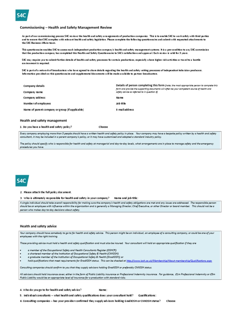 A health and safety questionnaire is an evaluation tool that is used to establish the health and safety considerations that a company gives to its staff or employees. Health and safety questionnaire complete the questionnaire to see if you are breaching any part of the occupational health and safety act and its regulations from some questions derived from it. Health and safety questionnaire please fill out for any risks or accidents observed or experienced by you at work during august 2020.